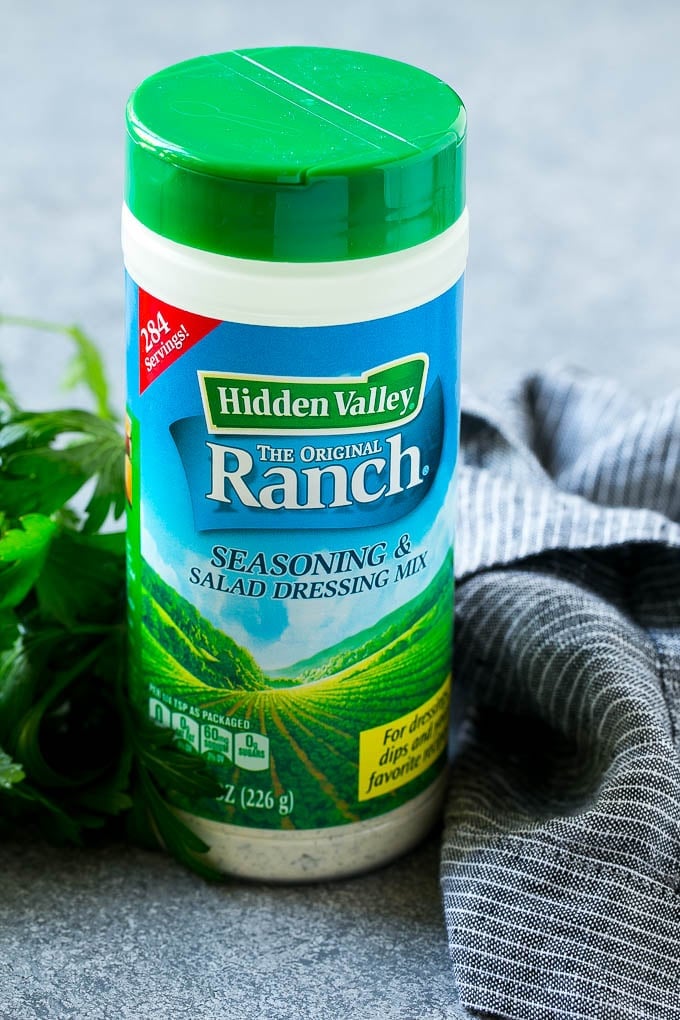 This recipe uses ranch seasoning powder, which is found in packets or a shaker bottle in the salad dressing area. Both ranch dip seasoning and ranch dressing seasoning packets will work.