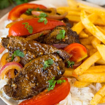 This lomo saltado is a classic Peruvian dish of tender beef that’s stir fried with tomatoes and onions in a savory sauce, then served with french fries and steamed rice. A unique offering that’s easy to make and always gets rave reviews!
