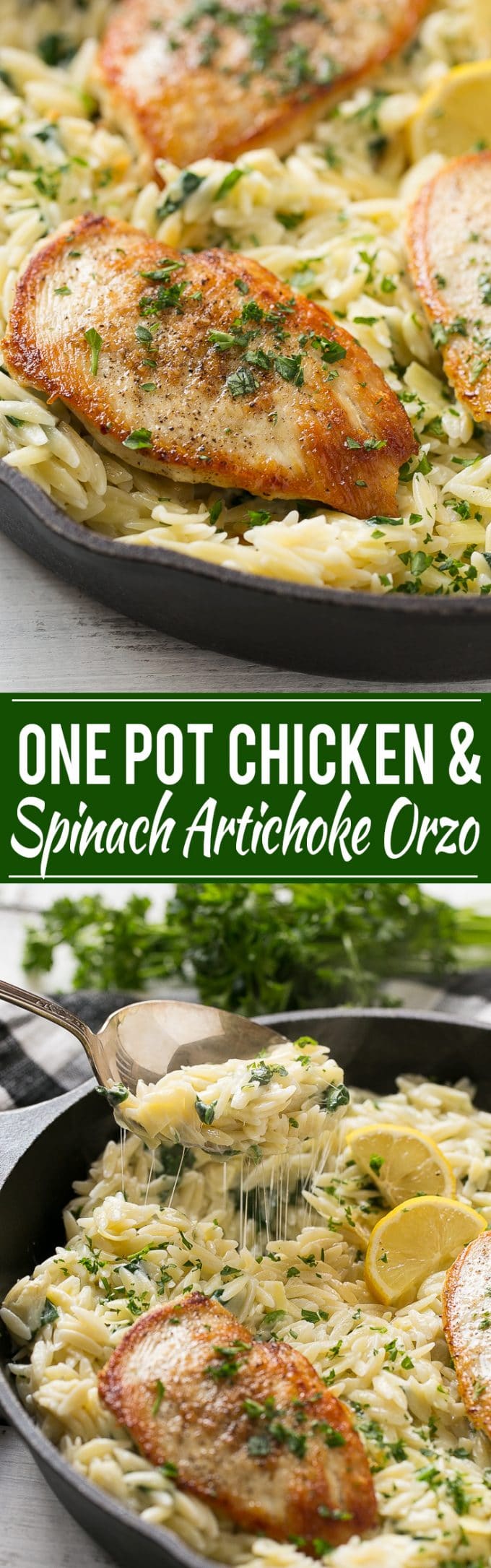 This one pot chicken with creamy spinach artichoke pasta is made with seared chicken breasts, orzo pasta, fresh spinach, artichokes and plenty of cheese. It’s a quick and easy weeknight dinner with less dishes to do at the end!