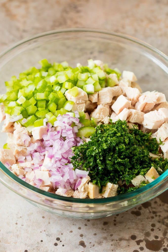 Dice your turkey into bite size pieces, then place it in a bowl. Add finely diced celery, red onion and parsley. Stir together a mayonnaise based dressing, then pour the dressing over the turkey and vegetables. Serve immediately, or refrigerate for later use.